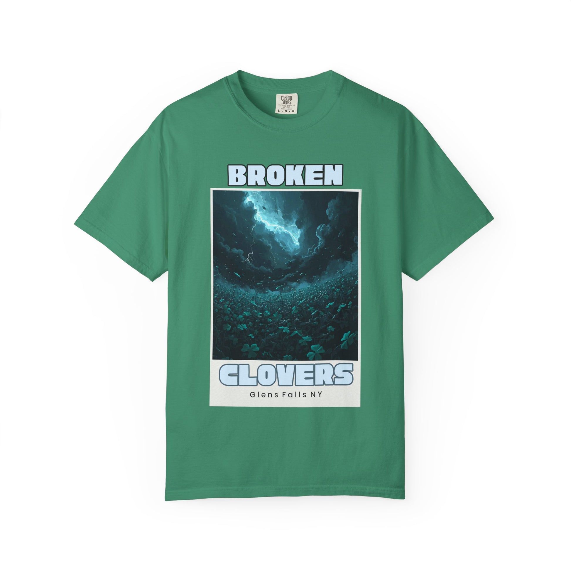 A heavyweight, garment-dyed tee with a moody, cinematic print that feels like a late-night soundtrack turned into fabric. The front art shows a stormy, deep-sea/sky scene above a field of clovers, framed like a retro poster and captioned “BROKEN CLOVERS” in soft, worn lettering. The dye process gives the shirt a lived-in, muted color and a soft hand—wear it loose and layered when you want something that reads vintage, introspective, and quietly bold. The relaxed cut and substantial cotton drape well, making this a go-to for cool evenings, low-lit shows, or slow drives with the windows down.