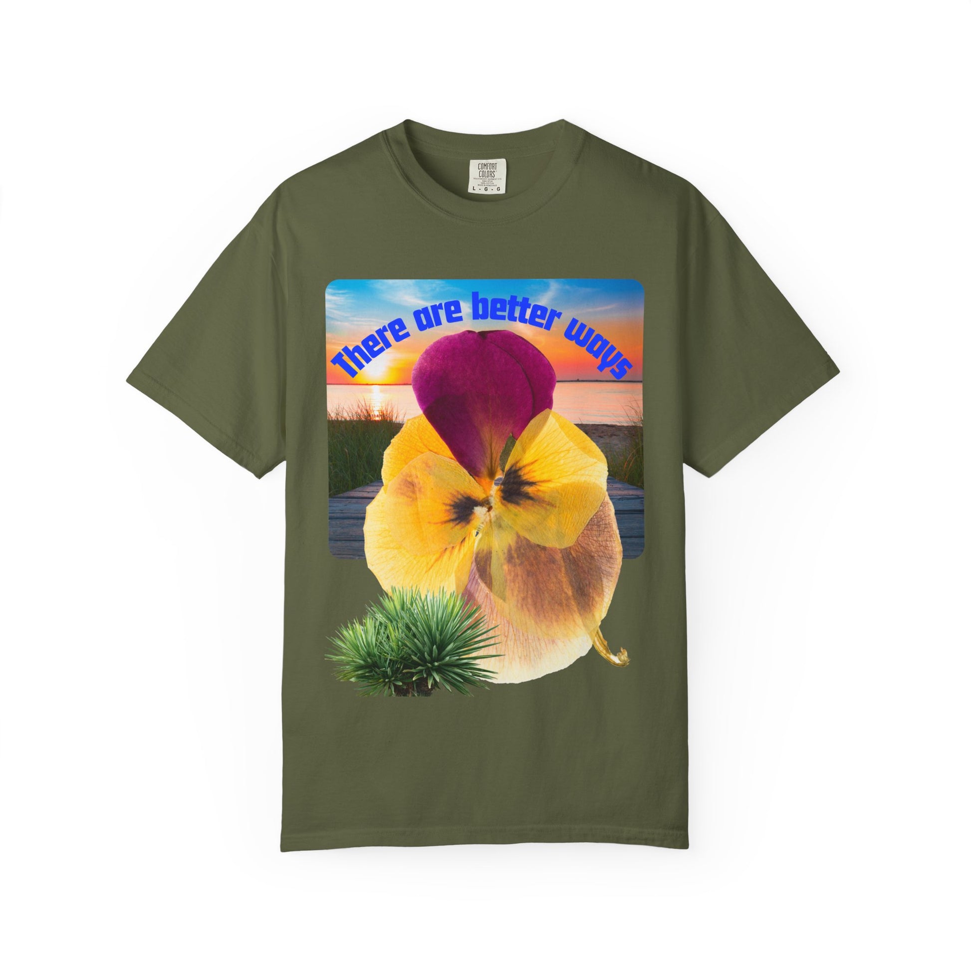 This garment-dyed tee brings a gentle, outdoorsy vibe to everyday wear. The relaxed heavyweight cotton feels substantial yet broken-in thanks to the post-construction dye process, so the color and texture soften with each wash while keeping structure. A large, sunlit floral graphic with warm sunset tones and the phrase "There are better ways" sits on the chest—subtle and thoughtful, it reads like a quiet reminder on a slow morning walk. The roomy fit and durable double-needle stitching make this shirt built for long weekends, campsite coffee, and easy conversations. Available in many earthy shades, it layers well under jackets or stands alone as a statement of unhurried taste.