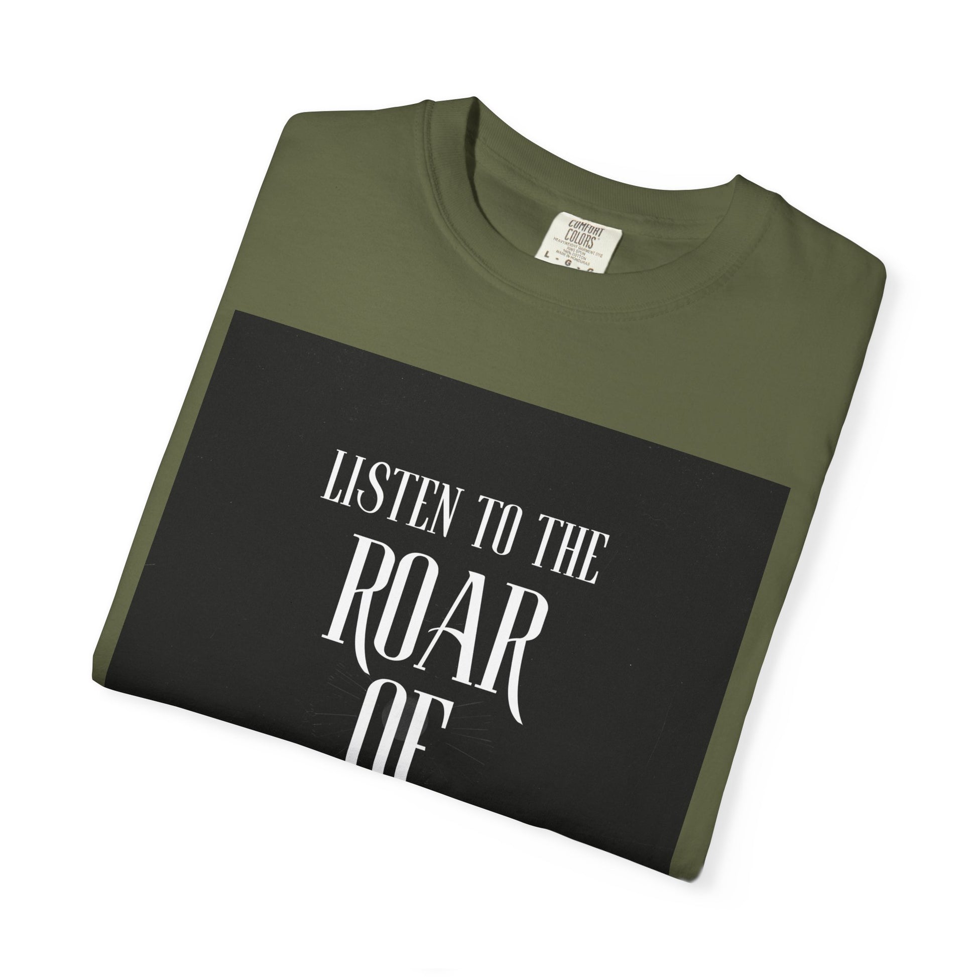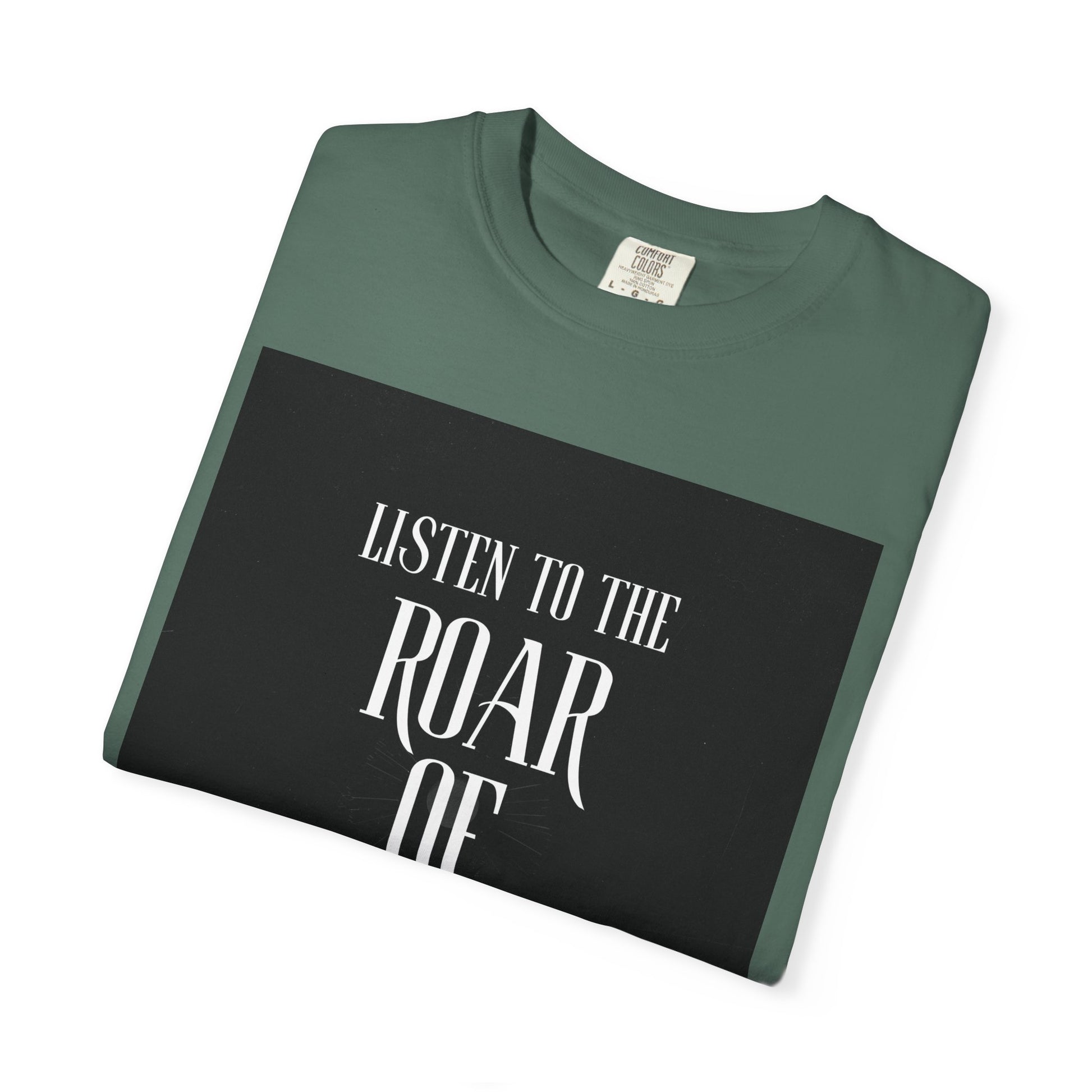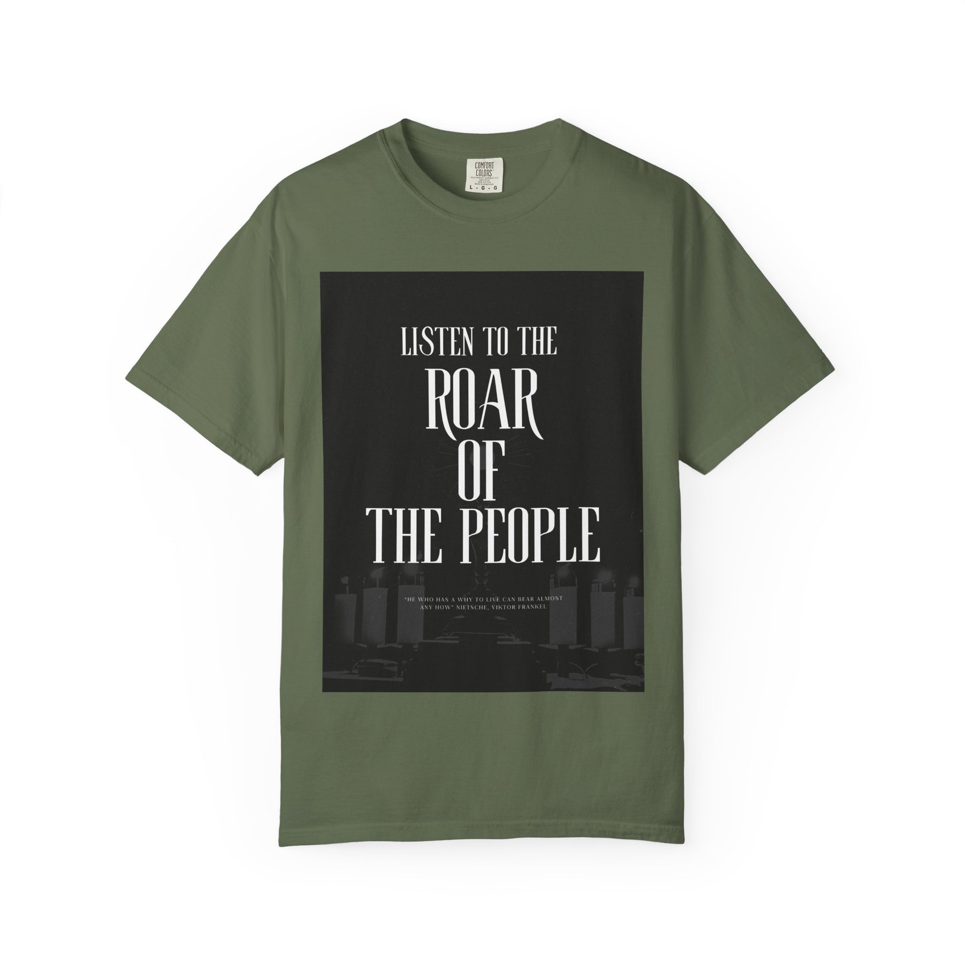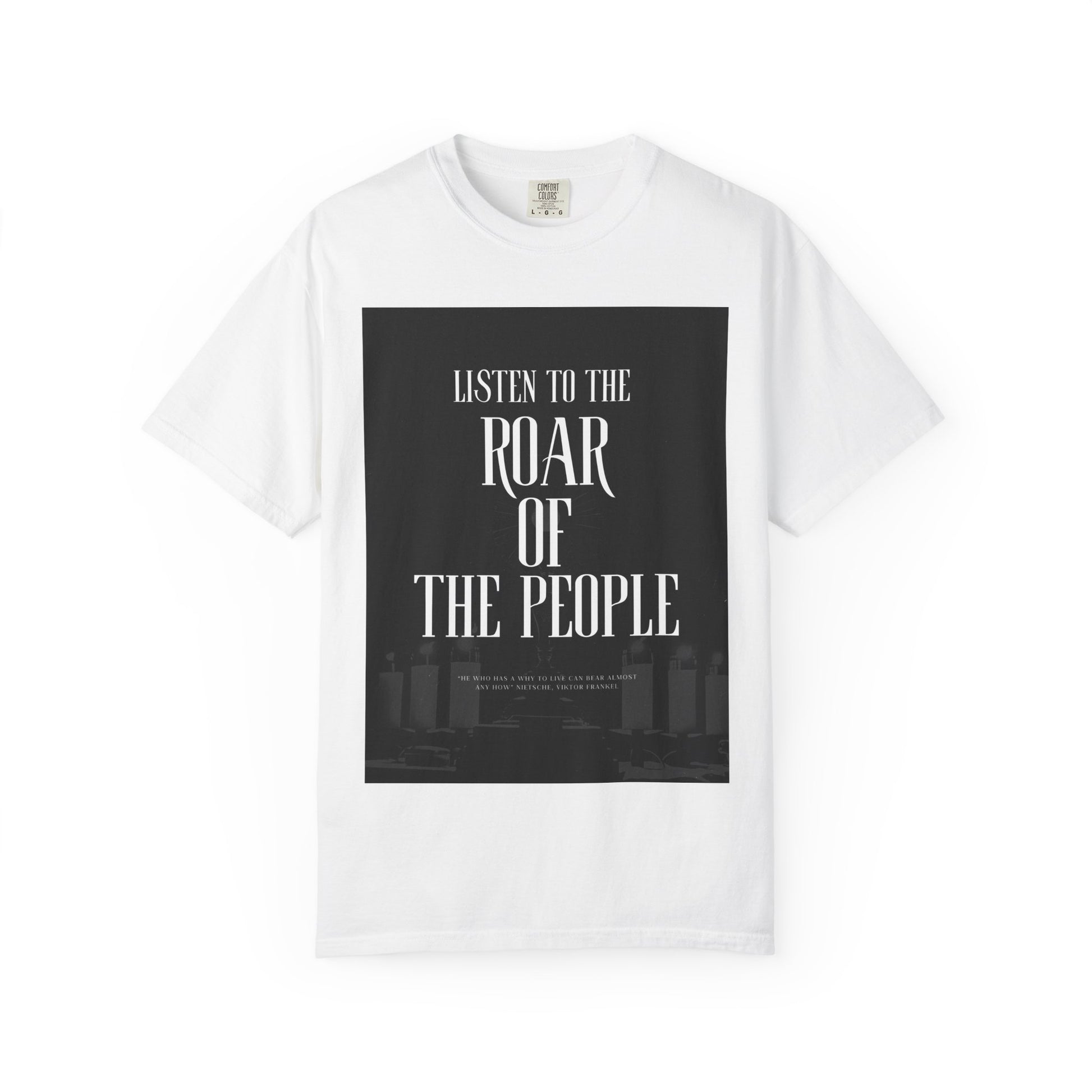 This relaxed-fit garment-dyed tee, available in 8 colors, carries a quiet, purposeful weight. The bold, high-contrast front print — “Listen to the ROAR of The PEOPLE” — sits atop a muted cityscape, like a banner raised above late-night streets. The soft, broken-in hand of the garment-dyed 100% ring-spun cotton and the medium-weight fabric make it feel lived-in from the first wear. It’s the kind of shirt worn to rallies, long shifts, or slow mornings when you want your clothes to say something without shouting. Subtle seams and a sewn-in label keep the silhouette clean and wearable every day.