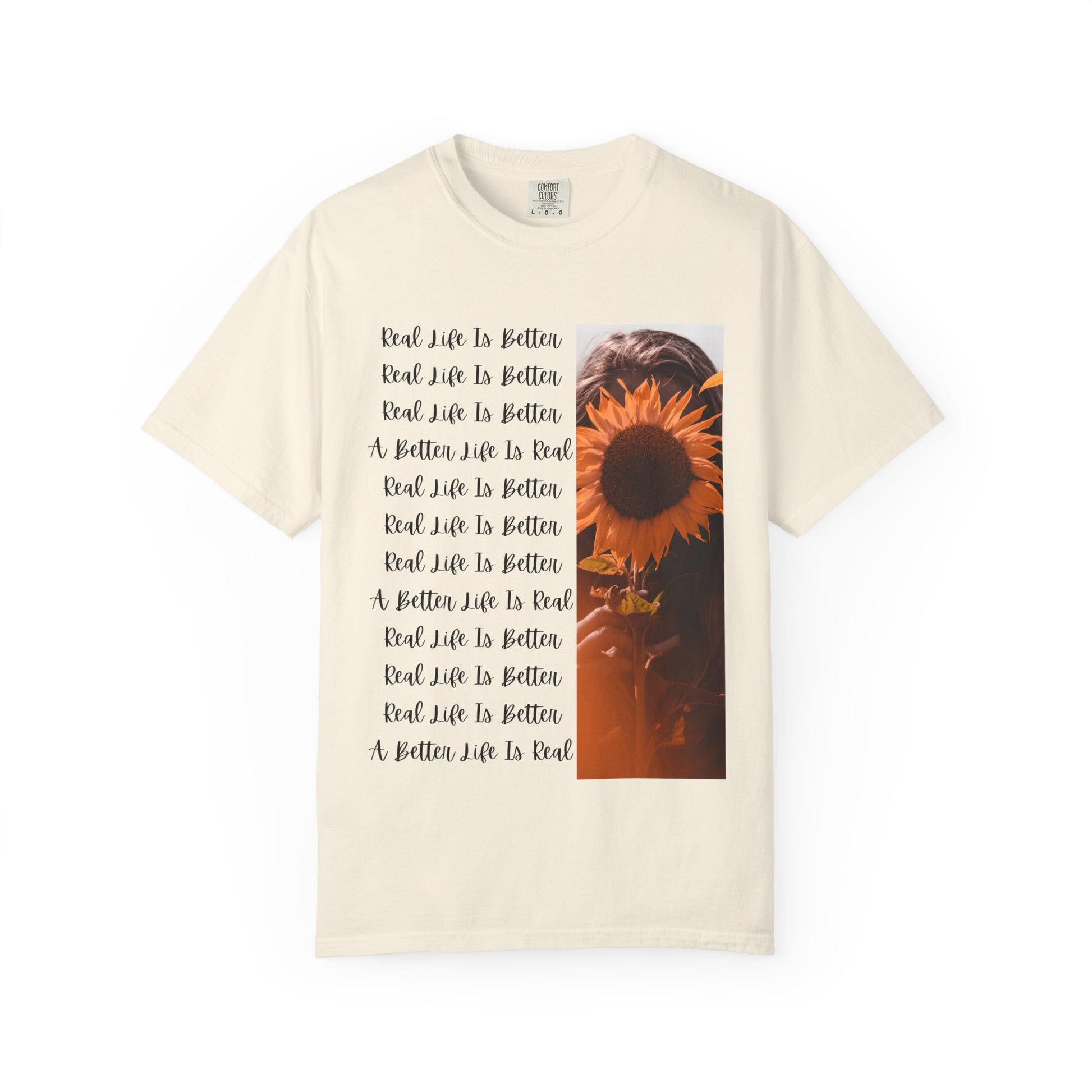 A laid-back, lived-in tee that speaks in quiet confidence: the message on the chest — “Real Life Is Better / A Better Life Is Real” — feels like a private reminder to slow down and choose what matters. The heavyweight, garment-dyed cotton wears softly against the skin and carries a subtle vintage wash that deepens with time. Cut with a relaxed fit and double-needle stitched seams, this shirt is built to move through everyday routines — weekend coffee runs, slow hikes, porch conversations — without fuss. The tubular construction keeps the silhouette clean, and the wide palette of colors lets you pick a tone that matches your mood. This is for people who prize authenticity over flash, who like clothing that already has a little history the first time they put it on.