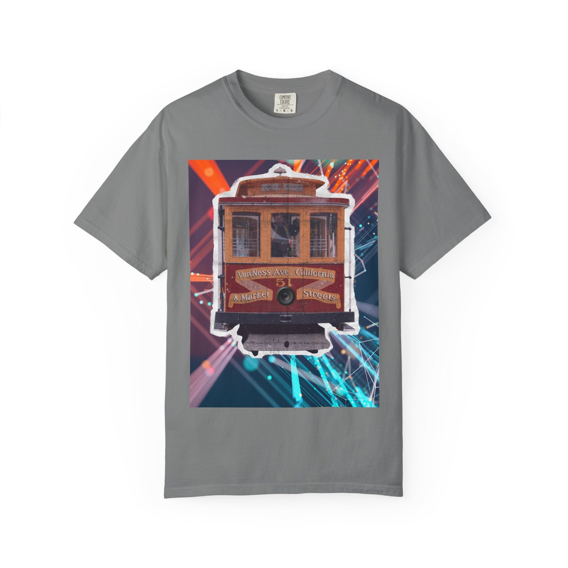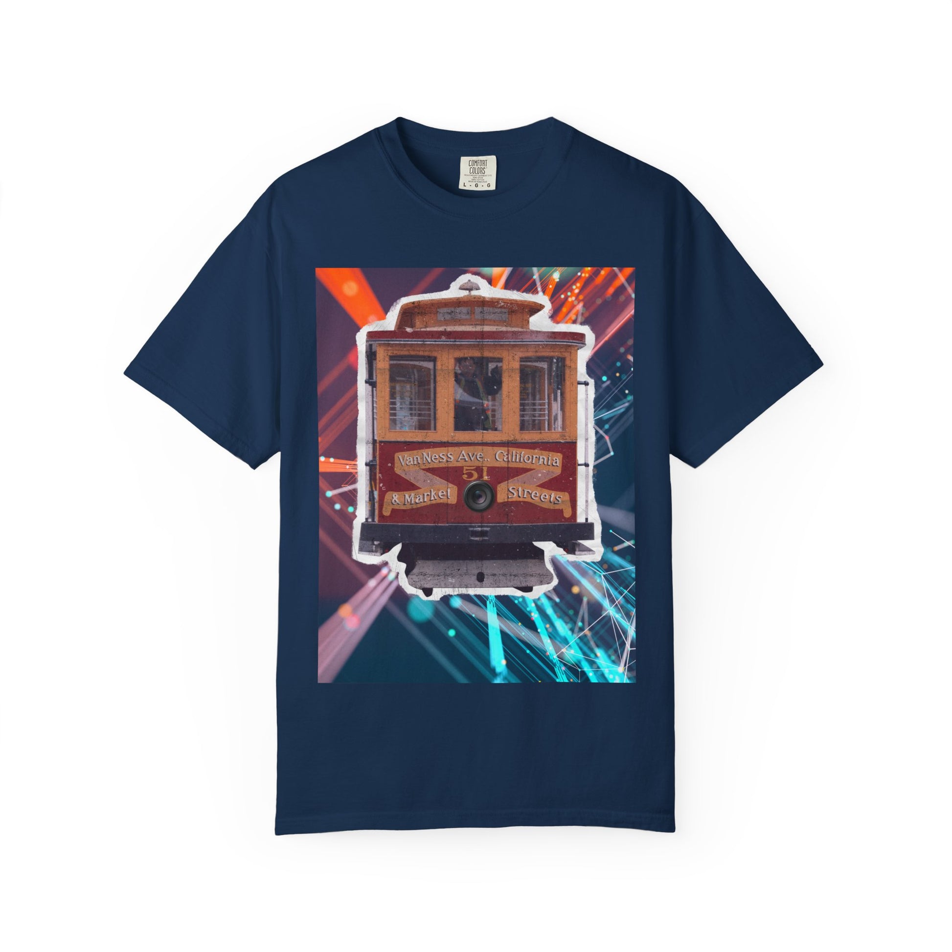 This relaxed-fit garment-dyed tee brings a lived-in softness and a splash of city nostalgia to your everyday wardrobe. The front features a bold, retro cable car illustration layered over dynamic, neon-like streaks — a design that reads like a night-time ride through a glowing urban corridor. Lightweight yet substantial, the shirt drapes comfortably and develops a unique patina with every wash. Wear it on weekend walks, late-night meetups, or while exploring neighborhoods — it feels familiar from the first wear and only gets better with time.