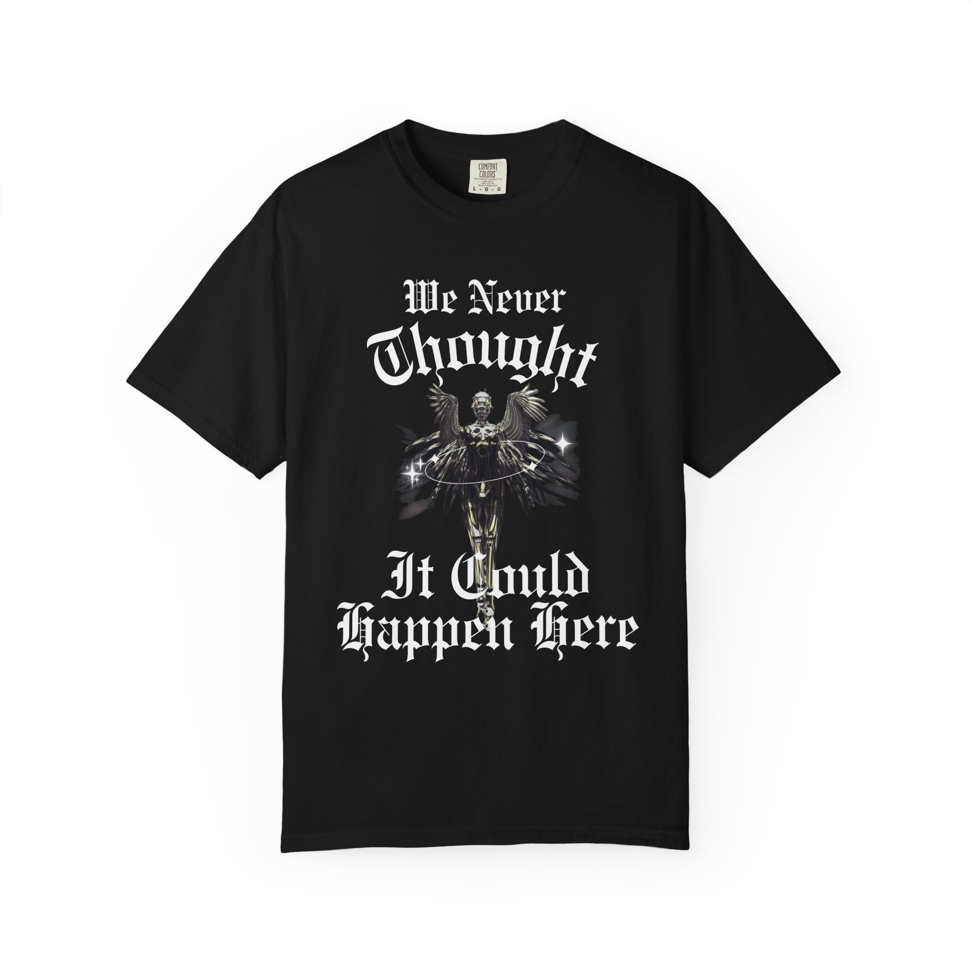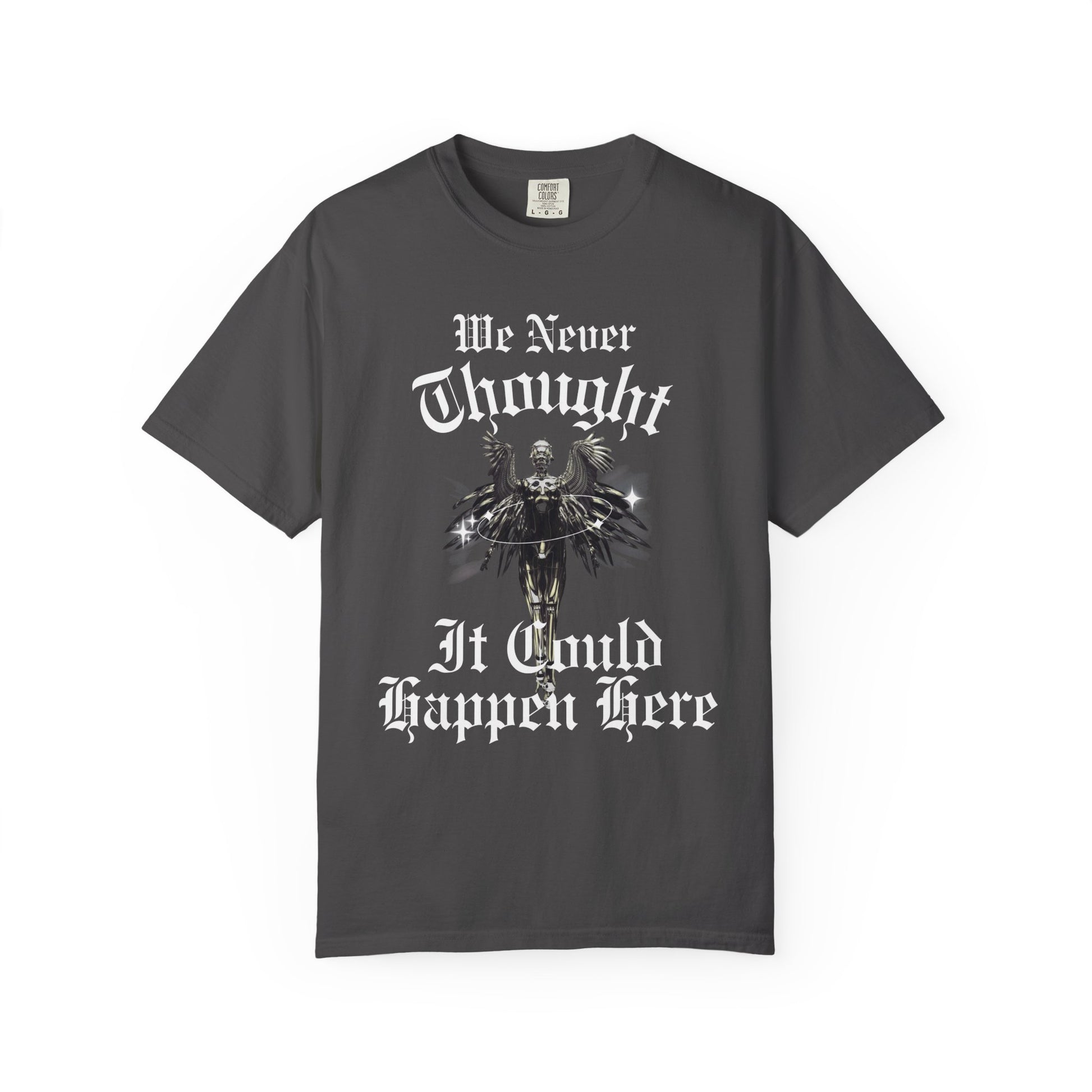 This heavyweight, garment-dyed tee carries a worn-in softness and a quiet gravity. The faded fabric and bold gothic print — “We Never Thought It Could Happen Here” around a dark, cloaked figure with spreading wings — make it feel like a statement piece you reach for when you want to be seen without shouting. Relaxed through the body and pre-shrunk for consistent fit, the shirt sits comfortably over jeans, layered under a jacket, or worn solo on cooler evenings. The dense cotton and double-needle stitching mean it will age with you, the color mellowing while the print keeps its stark, moody presence. For those who collect culture, mood, and meaning in their wardrobe, this tee blends vintage texture with a dramatic, contemplative graphic.